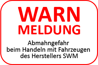 Der Fahrzeughersteller VW spricht derzeit Abmahnungen wegen angeblichen Markenrechtsverletzungen aus. Es geht dabei um Fahrzeuge des chinesischen Fabrikats SWM und der Typenbezeichnungen „G01F“, „G01FF“ und „G03F“.